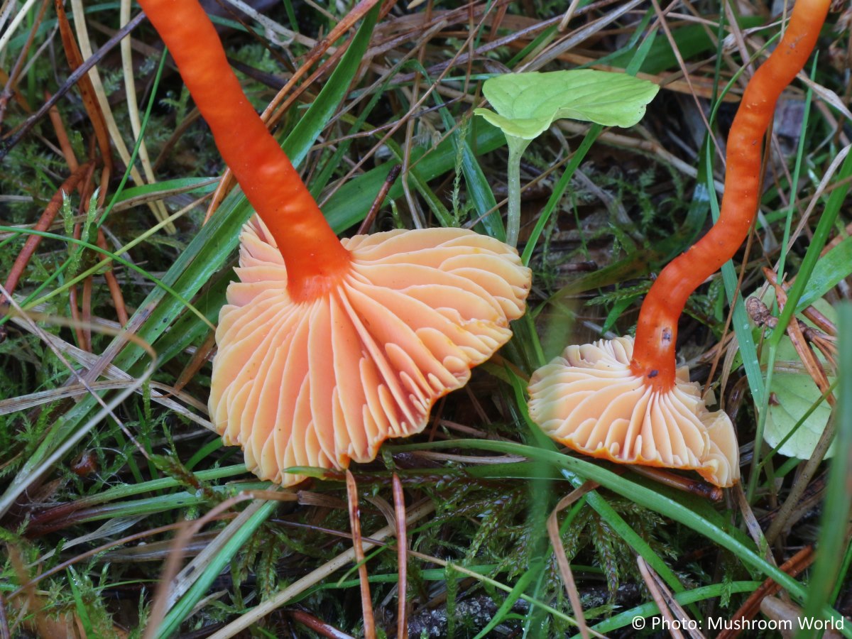 Cap small, convex to flat and sometimes shallowly funnel-shaped with age, often finely scaly or fibrillose rather than smooth. It ranges in colour from reddish-orange to orange-red, fading paler towards the margin, which may become crenate with maturity. The surface is dry or slightly tacky but never slimy, and the flesh is thin, firm, and yellowish to orangish. Gills distinctly decurrent, rather thick and waxy, spaced moderately to widely, and pale yellow to yellow, sometimes deepening in colour with age. Stem slender, cylindrical, and dry, occasionally silkily fibrillose, coloured orange to reddish-orange and usually paler towards the base. It lacks a ring and is solid or slightly hollow in mature specimens. Spore print white.