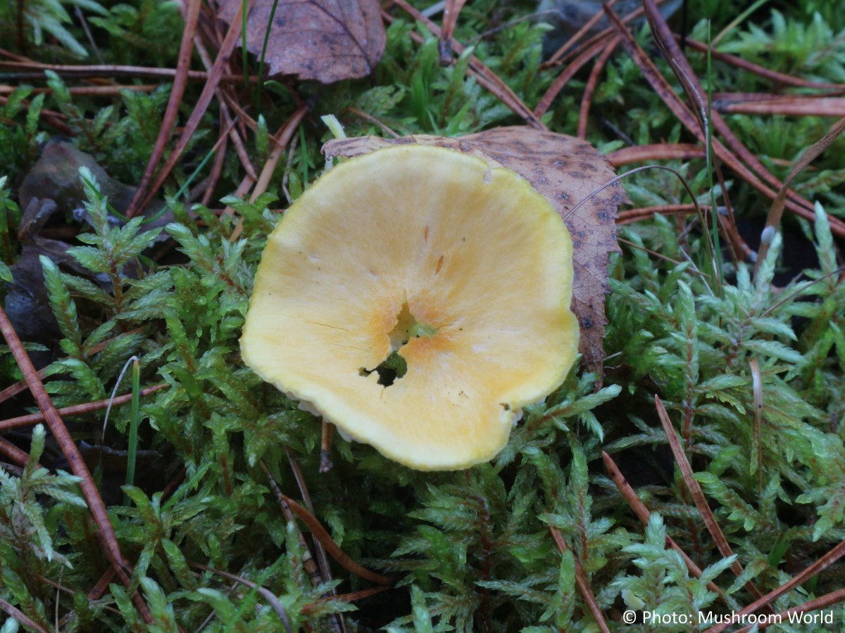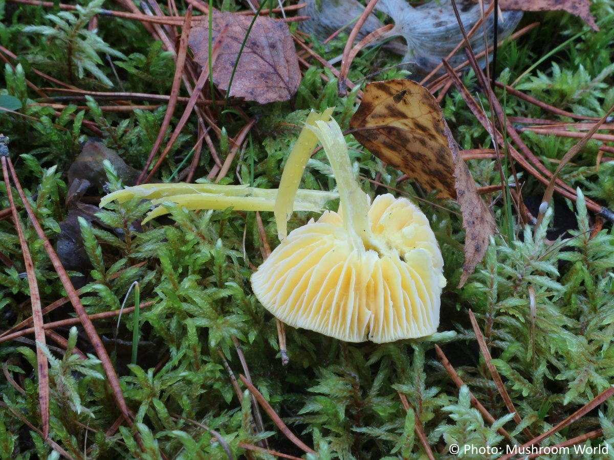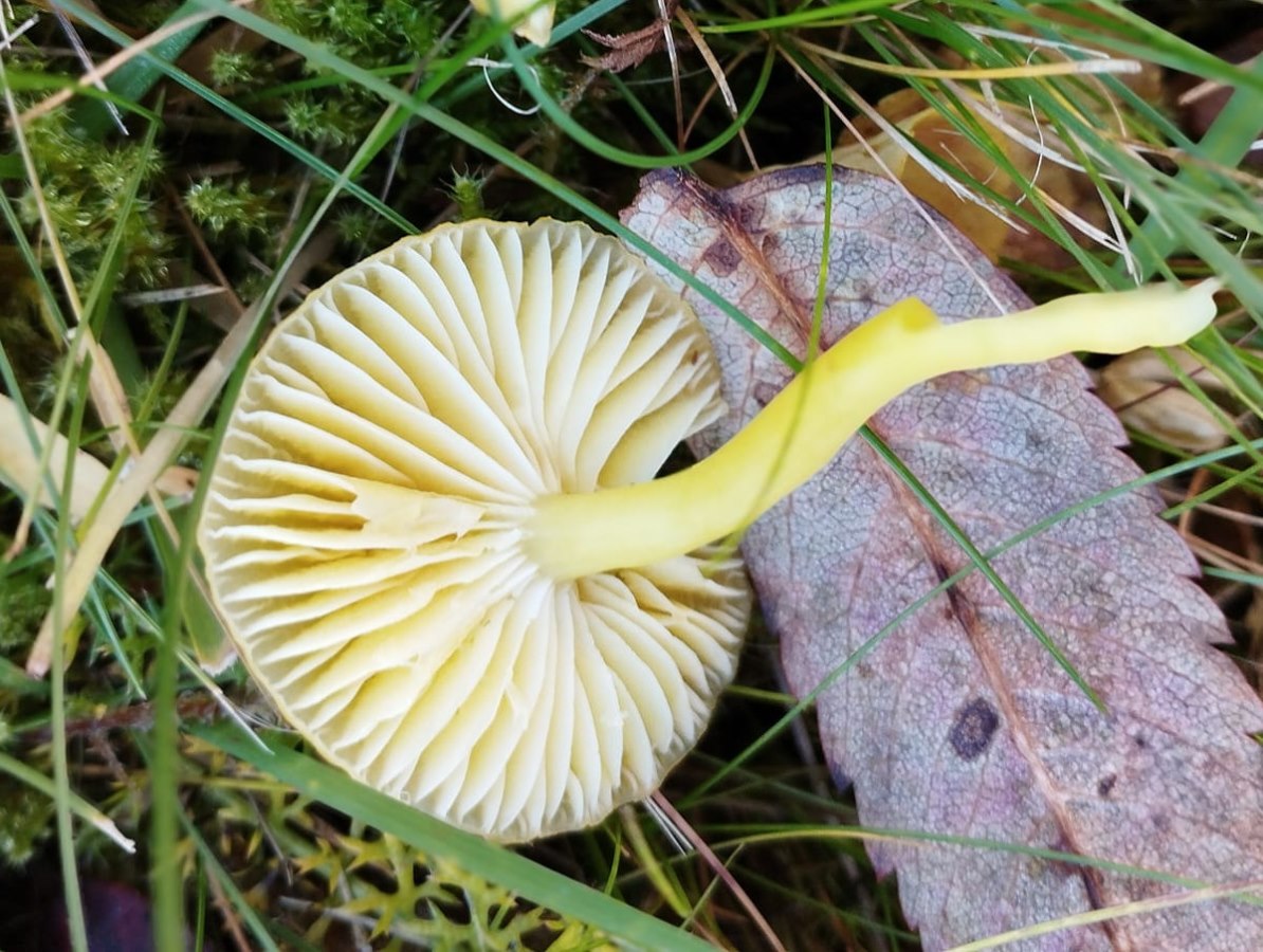 Cap small, convex to flat and sometimes slightly depressed at the centre, smooth and waxy in texture. It is bright yellow to orange-yellow, often with a greasy or slightly sticky surface when fresh. The flesh is thin, soft, and yellowish. Gills adnate to narrowly attached, fairly distant, and waxy in texture. They are pale yellow, becoming deeper yellow with age. Stem slender, smooth, and more or less equal, sometimes slightly tapering at the base. It is yellow throughout, often with a greasy appearance, and lacks a ring. Spore print white.
