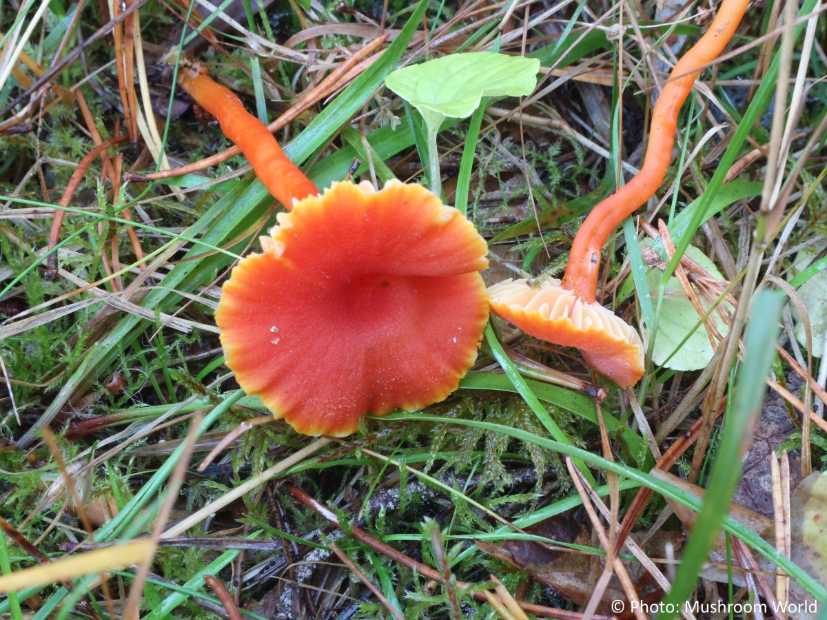 Cap small, convex to flat and sometimes shallowly funnel-shaped with age, often finely scaly or fibrillose rather than smooth. It ranges in colour from reddish-orange to orange-red, fading paler towards the margin, which may become crenate with maturity. The surface is dry or slightly tacky but never slimy, and the flesh is thin, firm, and yellowish to orangish. Gills distinctly decurrent, rather thick and waxy, spaced moderately to widely, and pale yellow to yellow, sometimes deepening in colour with age. Stem slender, cylindrical, and dry, occasionally silkily fibrillose, coloured orange to reddish-orange and usually paler towards the base. It lacks a ring and is solid or slightly hollow in mature specimens. Spore print white.