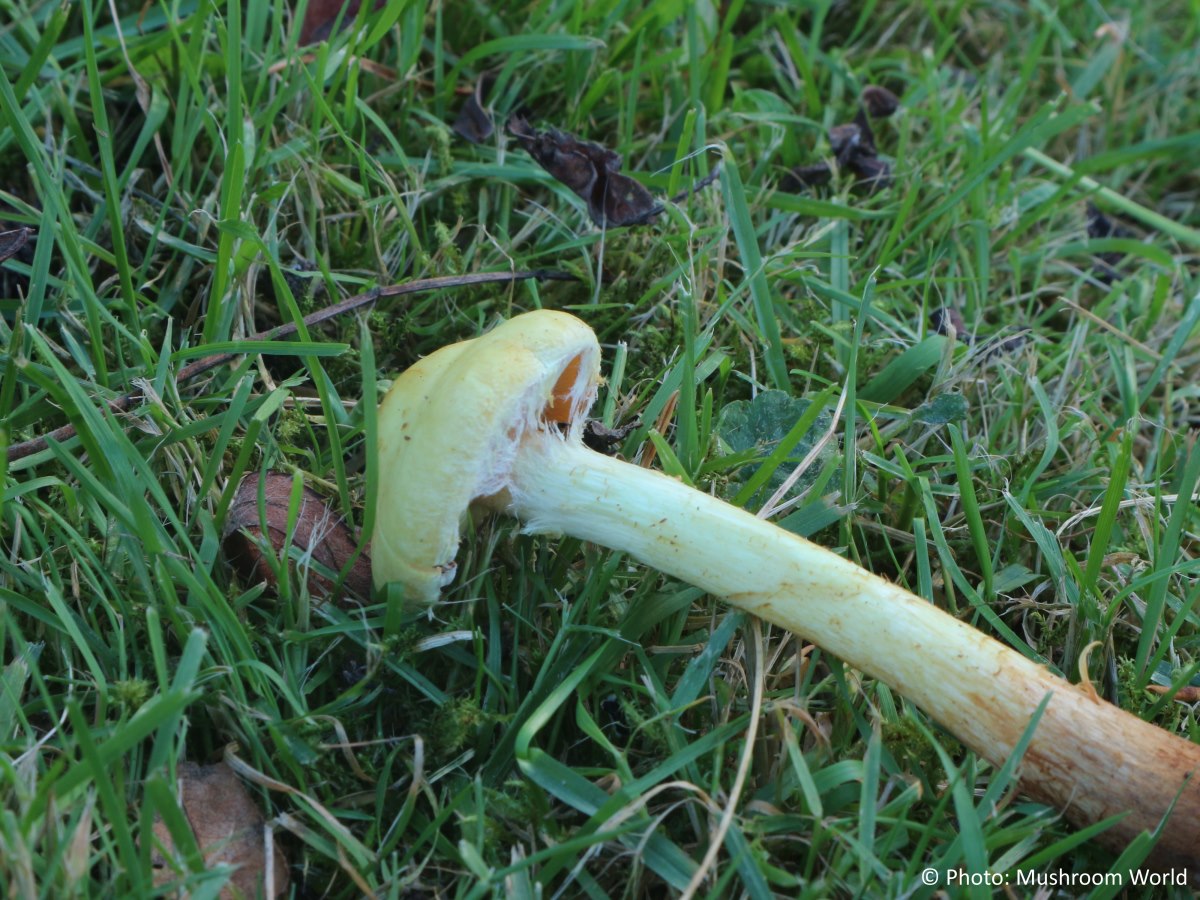 Cap bright yellow, occasionally with a hint of olive at the edge. It starts off convex and eventually flattens out. The surface is mostly smooth but may have pale velar remnants near the margin. When wet, it appears greasy, but it becomes dry when dry. The flesh is firm and yellow. Gills are adnate to slightly decurrent, whitish or pale yellow at first, later becoming dirty brownish yellow or rusty brown. They are at first covered by a quickly disappearing, whitish to yellowish partial veil. Stem yellow toward the top and rusty brown toward the base. It has mostly a ring zone resulting from the partial veil. Spore print reddish-brown.